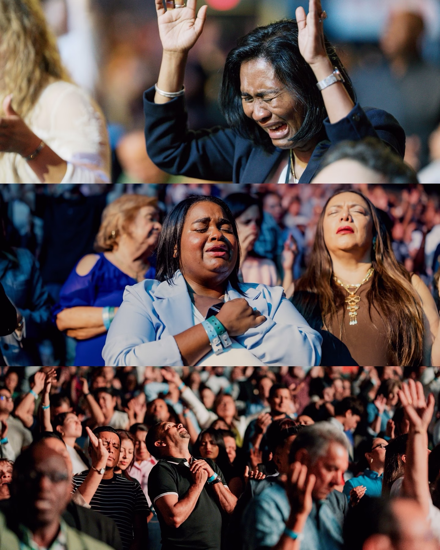 En el cierre, la multitud entera se postró de rodillas, desplazándose en señal de reverencia y entrega total. Entre lágrimas, cantos y adoración profunda, miles se rindieron a los pies de Jesús, dando toda la gloria y honra a Dios.
