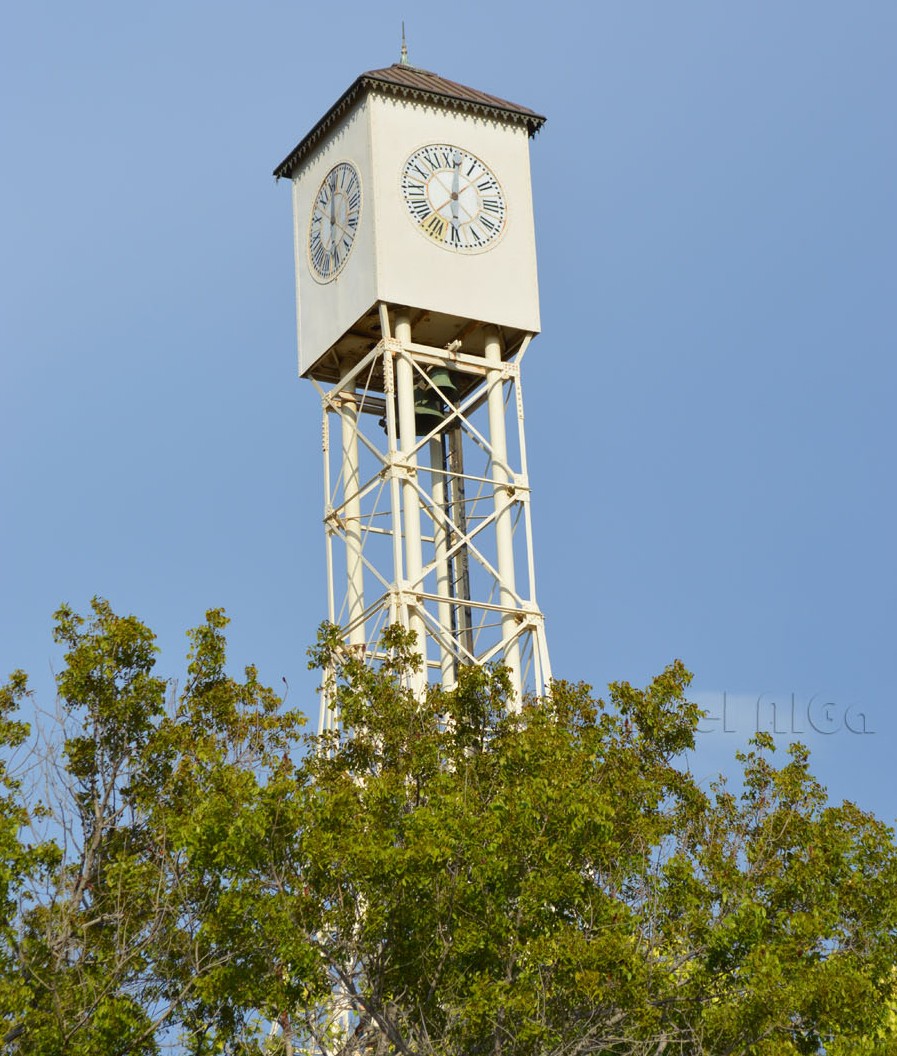 Este hermoso reloj sostenido por una columna de acero de base cuadrada, con piezas interiores en bronce posee tres campanas y cuatro esferas del tiempo, fue traído de San German, Francia, donde había estado instalado. Fue adquirido por el ayuntamiento de Montecristi y traído en el vapor Lavonia, siendo restaurado en el siglo XX por E. León Jiménez y Co., con mecanismo manual y la municipalidad ha mantenido una persona empleada solamente para dar cuerdas al sistema, por lo cual se conserva marcando el tiempo, como en sus inicios.